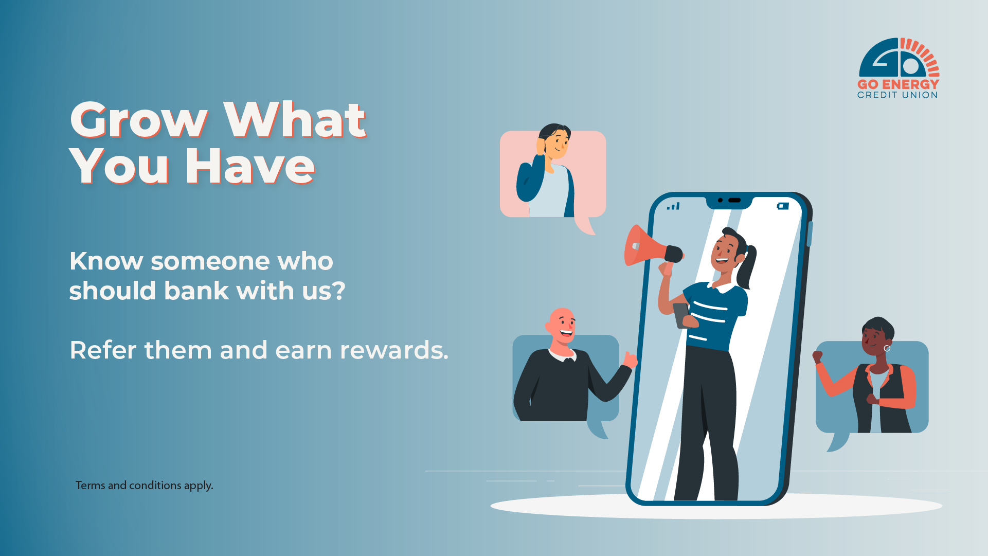 * Offer available 04/01/25-06/30/26. Terms and Conditions subject to change with notice. Referred member must be a new Go Energy member. All Requirements must be met for both parties to earn bonus: The referring member must submit a referral form prior to the new account being opened. The referred member must open the account with an initial deposit of $100, and keep a minimum balance of $100 for the first 30 days. Referring member must be at least 18 years of age or older and have an account in good standing to be eligible for the referral program. A Primary Savings account is required to establish membership, with $5 minimum deposit. The $5 Savings deposit does not apply to the $100 deposit required for the bonus. Bonus will be deposited into the account within 60 days of requirements being met. Primary Savings account with balance over $100 earn 0.100% APY*. Spark Checking account with balance up to $1,000 earn 0.250% APY*, and balance over $1,000 earn 0.250% APY*. *APY=Annual Percentage Yield effective as of 4/1/25. Fees could reduce earnings. This is a variable rate account. Rates may change at any time without notice. Bonus may be taxable and will be reported on IRS Form 1099-INT or 1099-MISC. Consult your tax advisor.